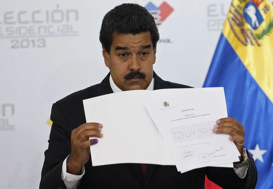 Read moreVenezuela's interim President Nicolas Maduro holds the official certificate declaring him winner of the presidential election at the Electoral Council in Caracas, Venezuela, on April 15, 2013. Venezuela's government-friendly electoral council quickly certified the razor-thin presidential victory of Hugo Chavez' hand-picked successor. Nicolas Maduro was elected by a margin of 50.8 percent to 49 percent over challenger Henrique Capriles. #