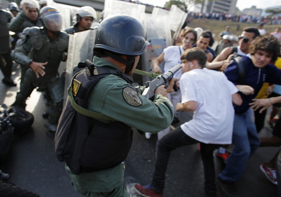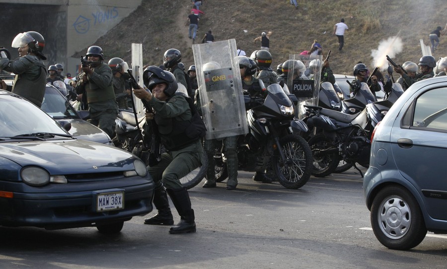 Read moreRiot police fire rubber bullets as demonstrators throw rocks at them, during clashes after opposition supporters and students blocked a highway in the Altamira neighborhood of Caracas, on April 15, 2013. #