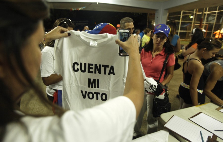 Read moreA Venezuelan woman holds up a shirt for sale that reads in Spanish "Count my vote" as others sign a petition in a park in Panama City, panama, on April 17, 2013. Venezuelans living in Panama are collecting signatures to send to Panama's President Ricardo Martinelli to demand their presidential election ballots be re-counted. The Obama administration has stood almost alone, along with Paraguay and Panama, in insisting on a recount of Sunday's presidential election. #