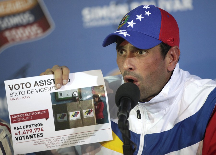 Read moreOpposition presidential candidate Henrique Capriles holds up a graphic and photograph as he says that an unusually high number of votes during Sunday's presidential election were made by voters who were assisted by an electoral worker, during a press conference at his campaign headquarters in Caracas, Venezuela, on April 16, 2013. Capriles called off a planned opposition march in Caracas on Wednesday, demanding a vote-by-vote recount of Sunday's presidential election after President-elect Nicolas Maduro summoned his supporters to take to the streets in the capital, raising the possibility of a confrontation with anti-government protesters. #