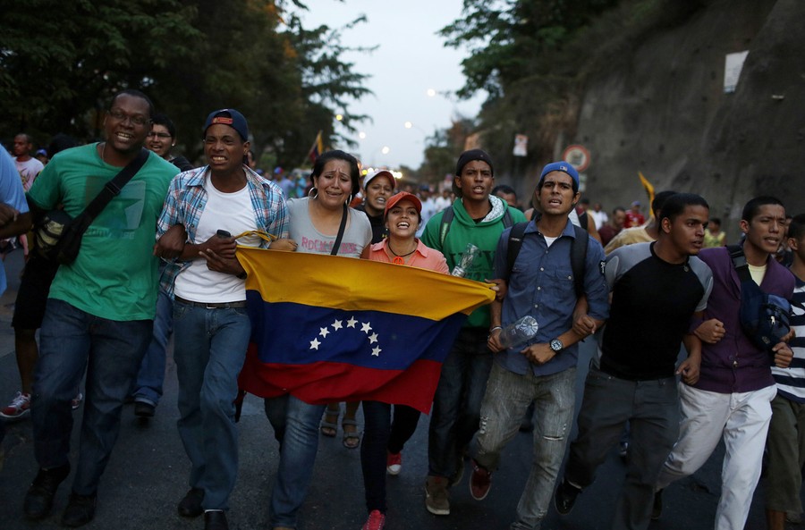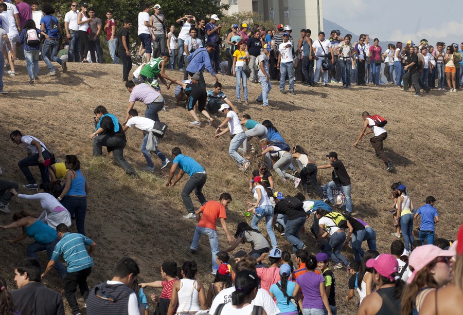 Read moreOpposition supporters and students run away from tear gas after they clashed with riot police as they tried to block a highway in Caracas, on Monday, April 15, 2013. #