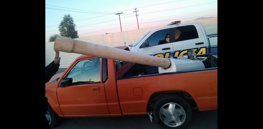 Read moreIn this image released by the Mexicali Public Safety Department, a man holds up an improvised cannon that was confiscated earlier in the day, February 26, 2013. Police in the border city say the cannon was used to hurl packets of marijuana across a border fence into California. #