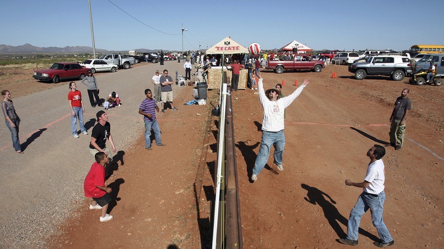 Read moreResidents of Naco, Arizona join residents of Naco, Mexico for a volleyball match during the fourth "Fiesta Bi-Nacional" at the fence that separates the U.S. (left) and Mexico (right), on April 14, 2007. #