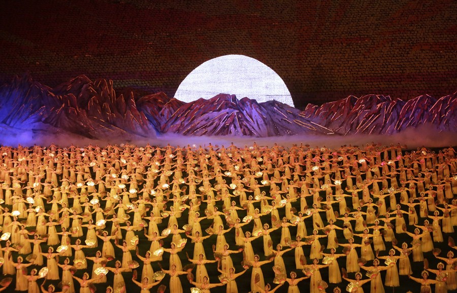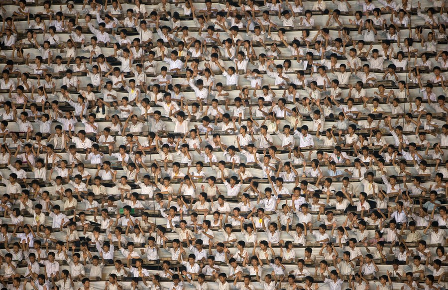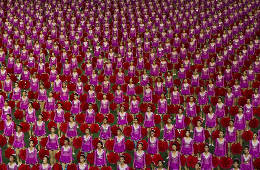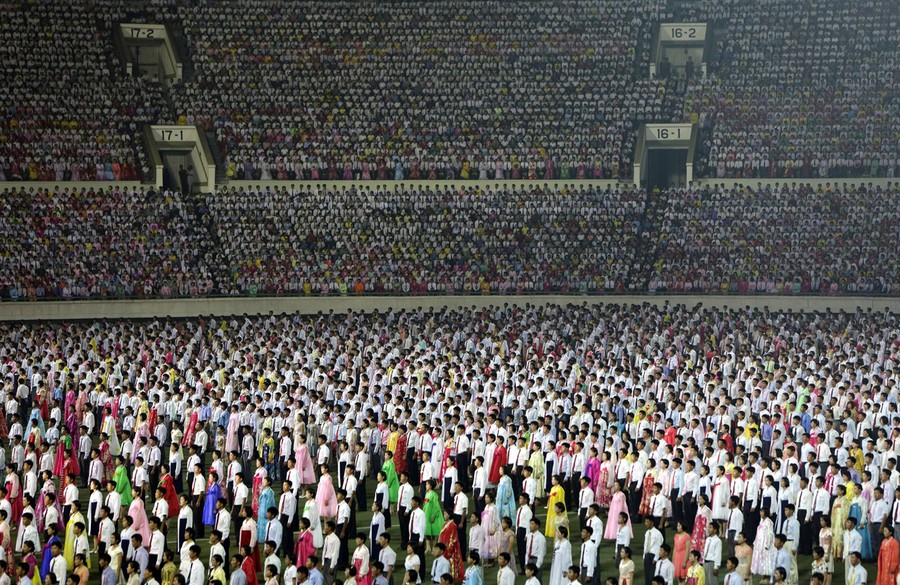 Read moreNorth Koreans perform during a mass gymnastic and artistic performance "Arirang", in Pyongyang, on July 26, 2013. The wall in the background is made up of cards held by individuals sitting in the stadium seats. #