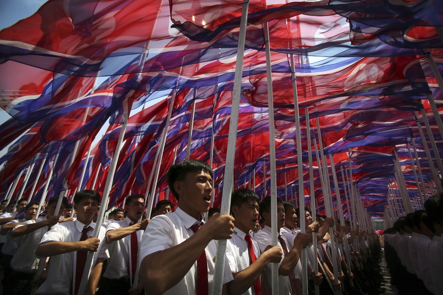 Read moreParade participants carry the North Korean national flags, on July 27, 2013 during a mass military parade celebrating the 60th anniversary of the Korean War armistice in Pyongyang. #