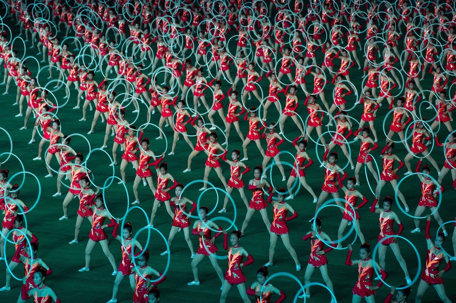 Read morePart 2: Pyongyang, North Korea: Dancers use hoops during an "Arirang" performance at the 150,000-seat Rungnado May Day Stadium in Pyongyang, on July 26, 2013. Arirang performances feature some 100,000 participants to create a "synchronized socialist-realist spectacular in a 90 minute display of gymnastics, dance, acrobatics, and dramatic performance, in a highly politicized package" according to the China-based North Korean travel company Koryo Tours. #