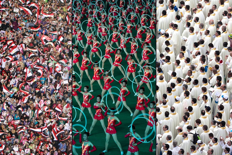 Read moreScenes of huge crowds in Egypt, North Korea, and Brazil. Left: Anti-Morsi protesters chant slogans during a mass protest to support the army in Tahrir square in Cairo, July 26, 2013. Center: Dancers use hoops during an "Arirang" performance at the 150,000-seat Rungnado May Day Stadium in Pyongyang, on July 26, 2013. Right: Clergy attend a Mass celebrated by Pope Francis on the Copacabana beachfront, in Rio de Janeiro, on July 28, 2013. #