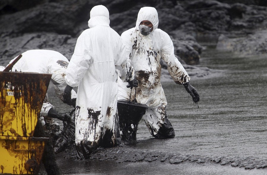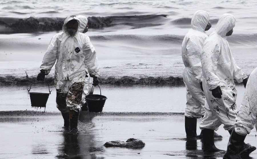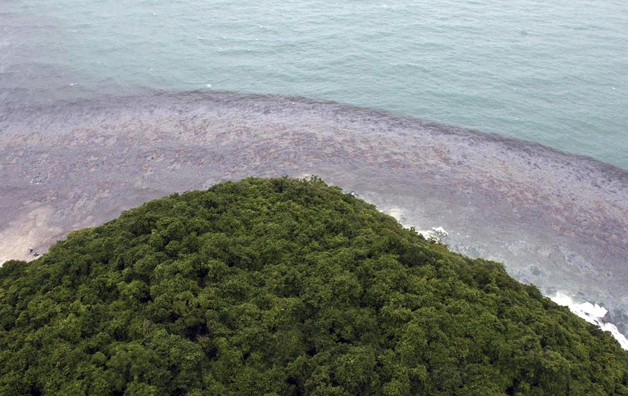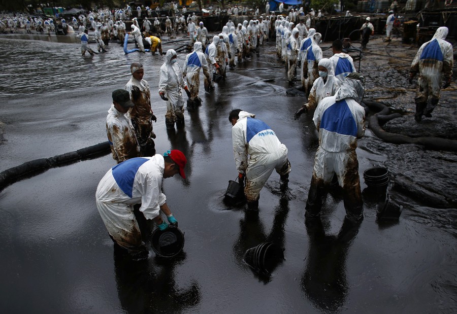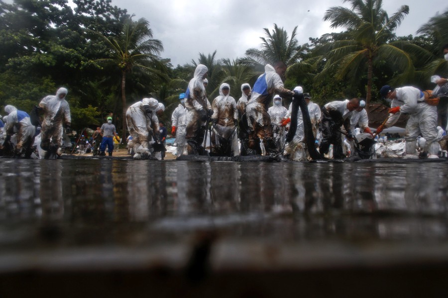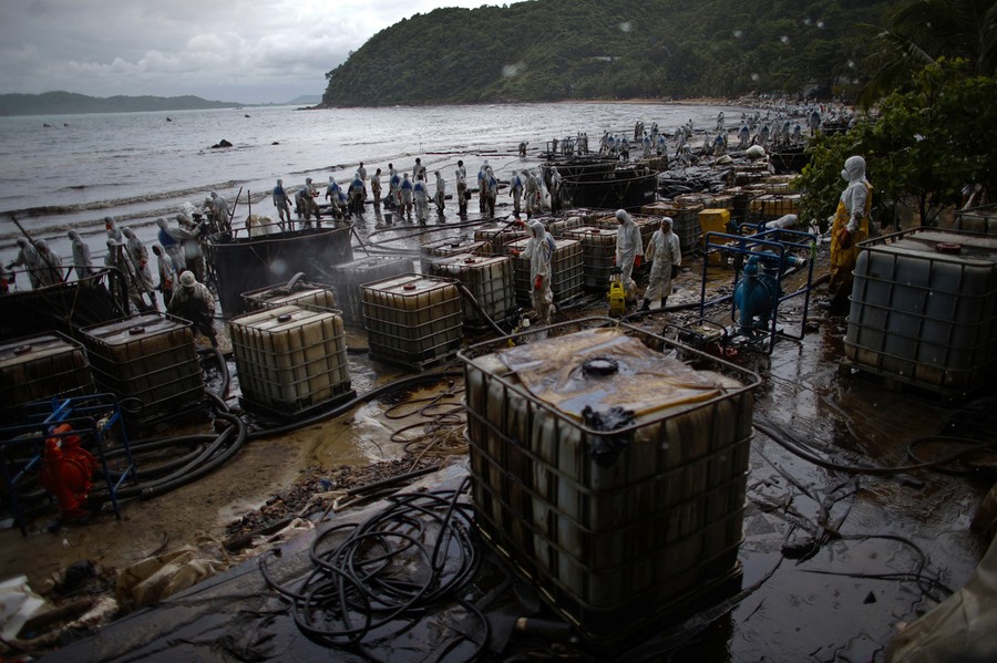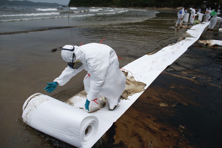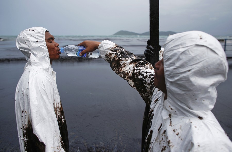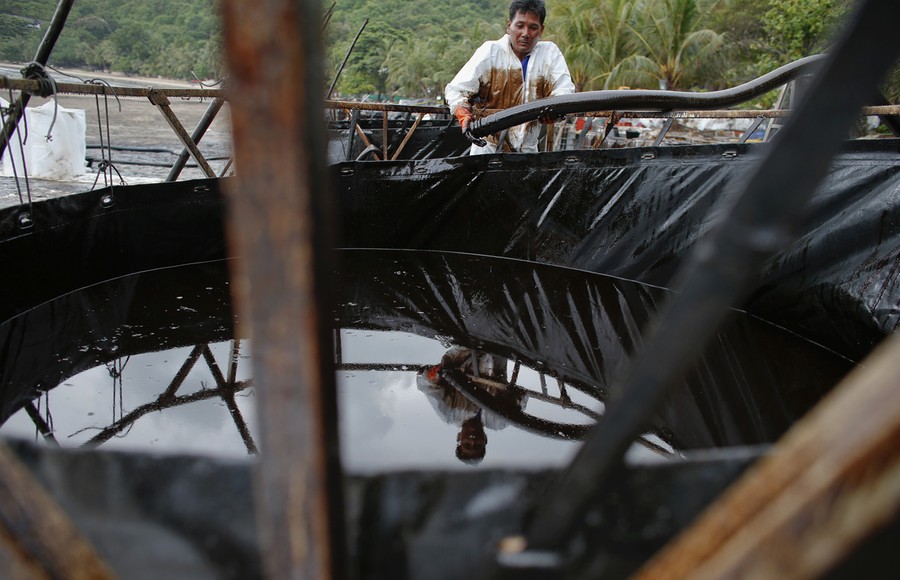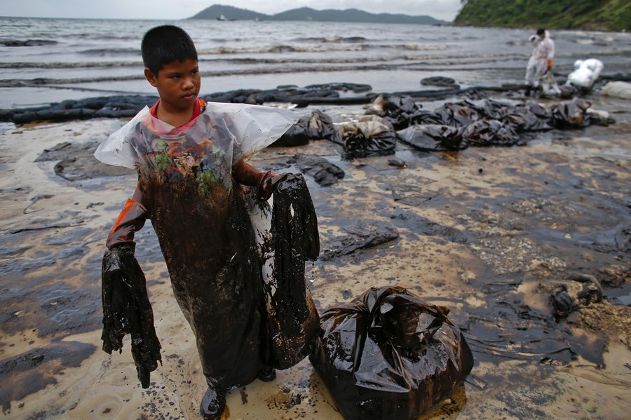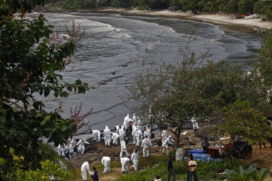Last Saturday, July 27, about 13,200 gallons (50,000 liters) of crude oil spilled into the Gulf of Thailand, pouring from a leaky pipeline, creating a huge slick miles wide. The oil slick soon began washing ashore on the tourist island of Samet, fouling several popular white sand beaches, and now has spread to nearby smaller islands. Pipeline operator PTT Global Chemical Plc. has apologized and pledges to have the spill cleaned within days, as tourism officials have raised alarms about the sharp drop in tourist dollars. Gathered here are images of the early clean-up work taking place on Thailand's Samet Island.