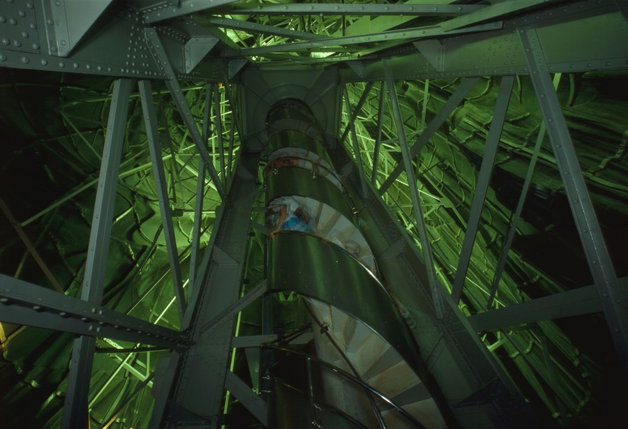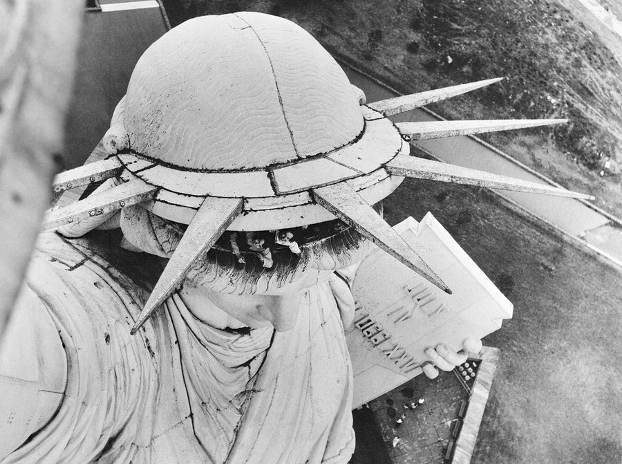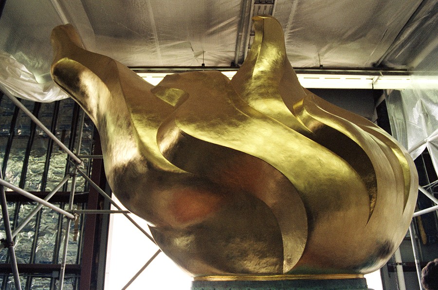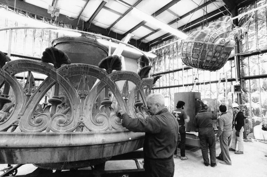 Read moreA workman makes an adjustment to the torch from the Statue of Liberty at Liberty Island workshop in New York, on December 16, 1984 as the flame, in background, is lowered to a pedestal for a fitting before shipment to California. #