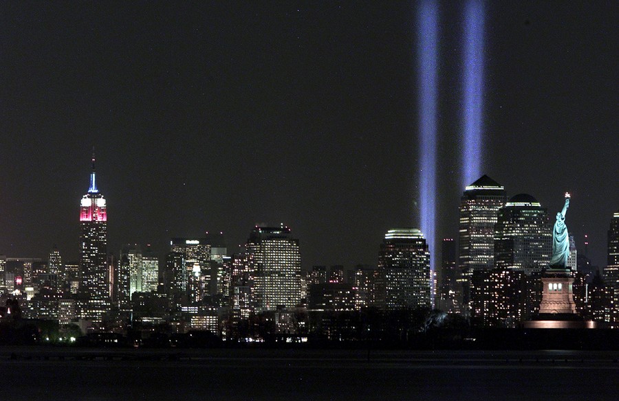 Read moreThe "Tribute in Light" memorial shines behind the Statue of Liberty, on March 11, 2002 on the six-month anniversary of the World Trade Center terrorist attacks in New York City. #