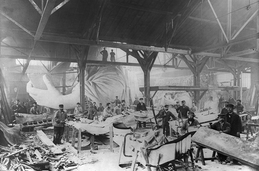 Read moreLeft: the hand and torch of the Statue of Liberty being built in a Paris studio around 1876. Right: the head of the Statue of Liberty, inside a Paris studio around 1880. #