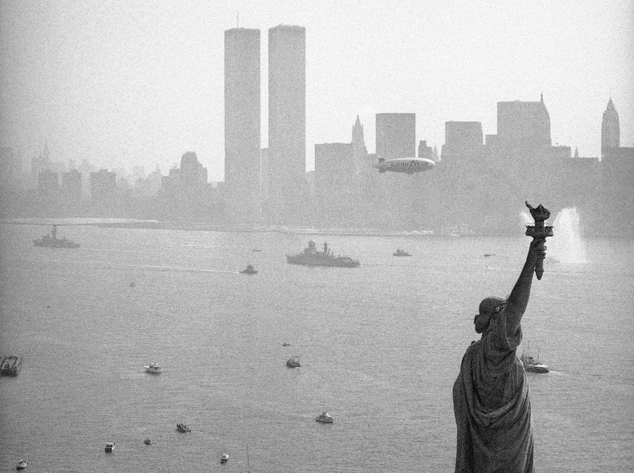 Read moreThe Statue of Liberty, foreground, with warships moving up the Hudson River past the Twin Towers of the World Trade Center and the New York Skyline in Operation Sail preliminaries, on July 3, 1976. #