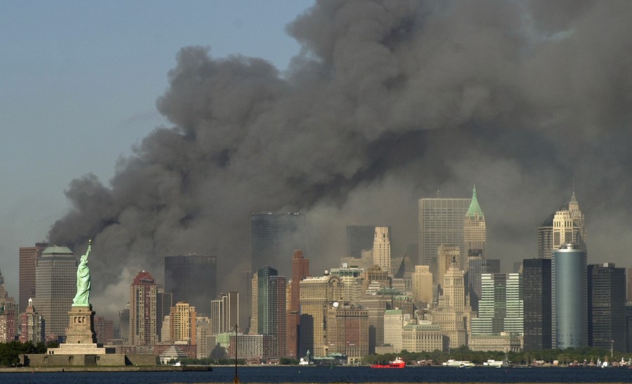 Read moreOn September 11, 2001, thick smoke billows into the sky from the area behind the Statue of Liberty, lower left, where the World Trade Center towers, now collapsed, had stood. #