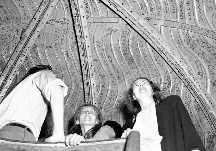 Read moreTourists examine writing on the inside of the top of Lady Liberty's crown in New York on August 4, 1946. Many of the visitors to the monument left behind markings to commemorate their visit to New York. #