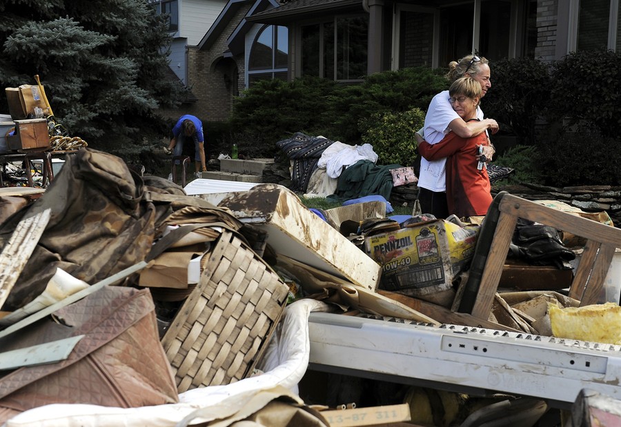 Read moreHomeowner Chris Ringdahl, right, is comforted by family friend Hillari Hansen, in front of her possessions as they clean up from the floodwaters in Longmont, Colorado, on September 16, 2013. #
