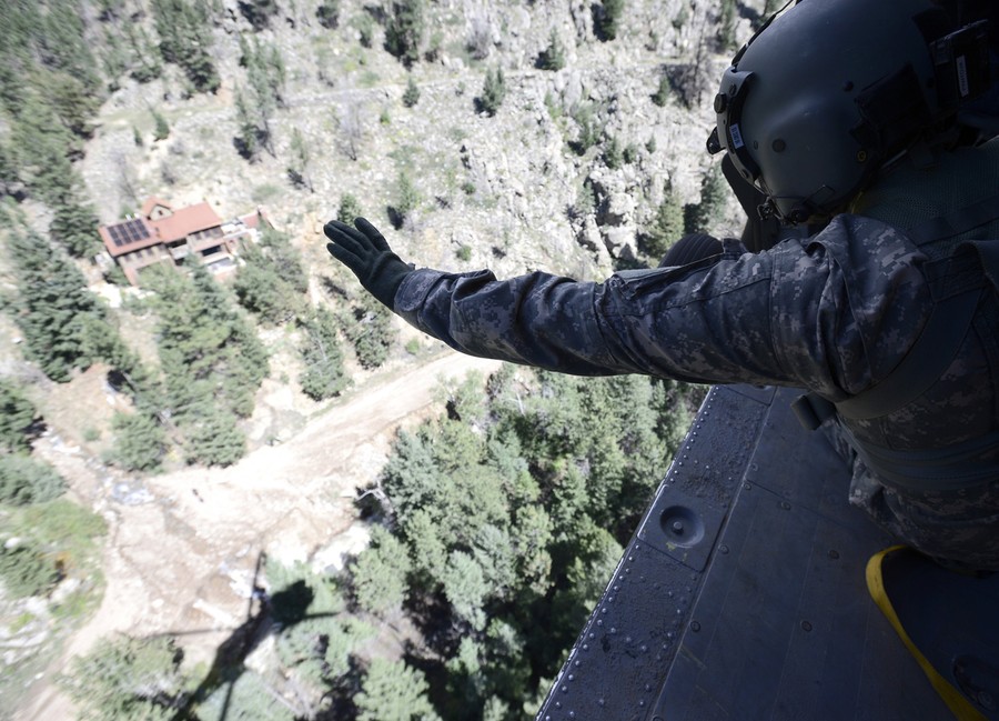 Read moreStaff Sergeant Jose Pantoja, with the 2-4 GSAB 4th Infantry Division based in Ft. Carson, waves to people in Left Hand Canyon after they indicated their condition and that they didn't need help from a Black Hawk helicopter near Jamestown, Colorado, on September 17, 2013. #
