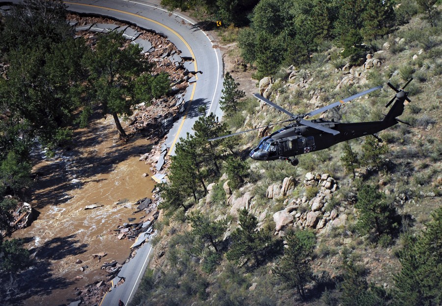 Read moreA U.S. Army UH-60 Black Hawk helicopter assigned to the Colorado Army National Guard lands to evacuate a resident stranded on a highway damaged by flooding in northern Colorado, on September 14, 2013. #