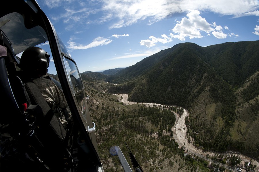 Read moreChief Warrant Officer Troy Parmley, a pilot with the Delta Company, 3rd Battalion, Colorado Army National Guard, looks at floodwaters from recent rainfall while flying a UH-72 Lakota helicopter during relief and recovery operations near Fort Collins, Colorado, on September 18, 2013. Colorado Guard members have evacuated about 700 people by ground, with military aerial evacuations currently totaling 2,394. #