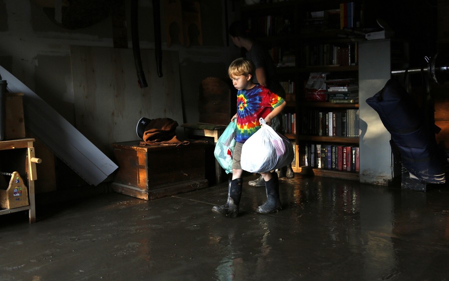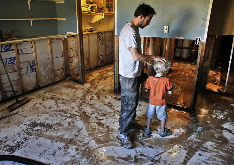 Read moreChad Obrien comforts his four year old son Elijah, as he works to remove waterlogged and contaminated floors and walls from his flooded basement, which was wrecked in recent flooding, in Longmont, Colorado, on September 18, 2013. #