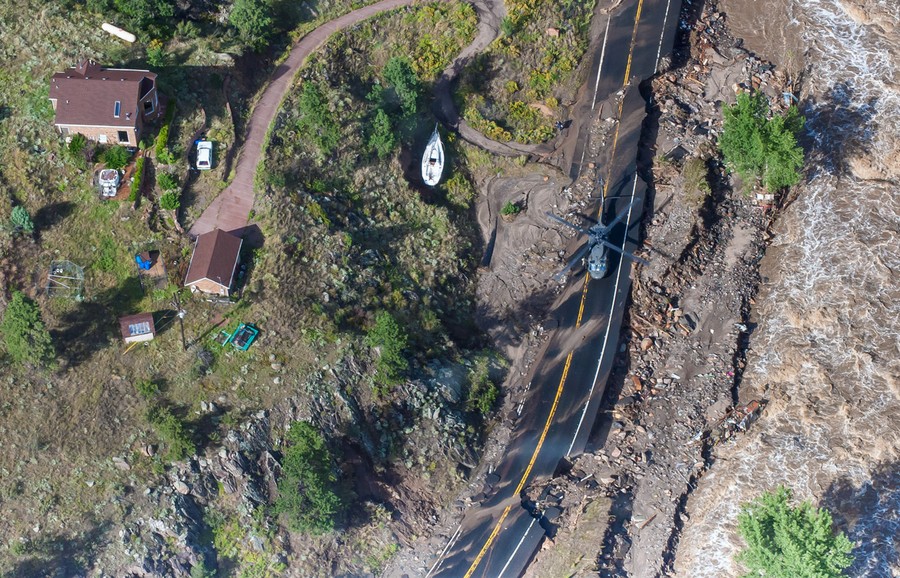 Following days of record-setting rainfall and historic flooding across Colorado's Front Range, skies have cleared, and the recovery has begun. The number of people still unaccounted for has dropped to about 200, as helicopter teams are fanning out across the foothills in the largest aerial rescue operation since Hurricane Katrina in 2005. Colorado authorities coping with the aftermath are now preparing possible evacuations of prairie towns in danger of being swamped as the flood crest moves downstream. Tens of thousands of homes were damaged or destroyed, a problem exacerbated by the fact that only about 1 percent of Colorado homeowners have flood insurance. The photos below show some of the events of the past few days, following up on Monday's Historic Flooding Across Colorado.