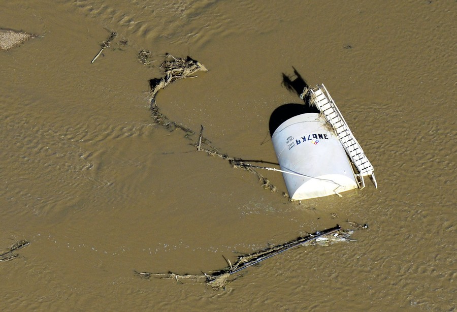 Read moreVisible results of flash floods that swamped natural gas and oil well pads and in some cases dislodged storage tanks in Weld County, Colorado, on September 17, 2013. Hundreds of natural gas and oil wells along with pipelines were shut down by the flooding, as state and federal inspectors gauge the damage and look for contamination from inundated oil fields. #