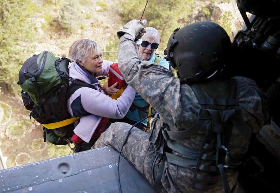 Read moreU.S. Army Staff Sgt. Jose Pantoja, a flight medic with Charlie Company, 2nd General Support Aviation Battalion, carries Mike Daniels, an evacuee, up a hoist onto a UH-60 Black Hawk helicopter during a flood rescue and recovery operations in Boulder, Colorado, on September 16, 2013. #