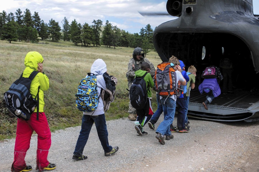 Read moreResidents and children from Cal-Wood Education Center in Jamestown, Colorado await a rescue helicopter flown by the U.S. Air National Guard after severe flooding shut down major roads leading out of town in this September 14, 2013 photo. #