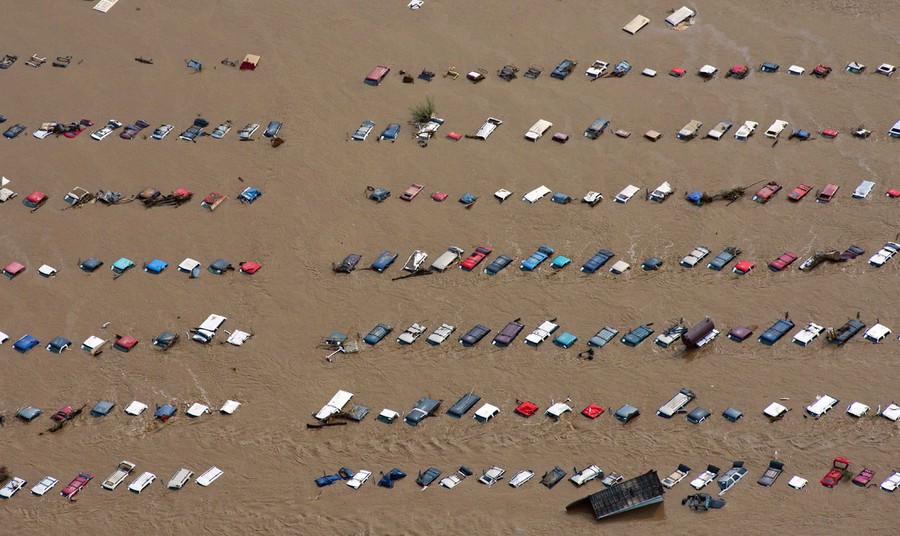 Read moreA field of parked cars and trucks sits partially submerged near Greeley, Colorado, on September 14, 2013, as debris-filled rivers flooded into towns and farms miles from the Rockies. #
