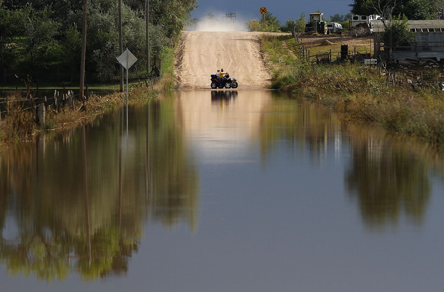 Read moreA couple on an ATV turn around at the edge of a flooded road in La Salle, Colorado, on September 14, 2013. The Sanchez family has lived there for 11 years and said they've never seen anything even close to this level of flooding in the area. #