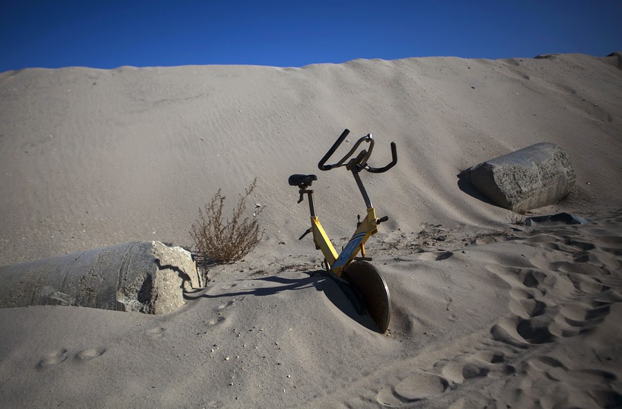 Read moreAn abandoned exercise bike sits in a sand dune near a home destroyed last year by Superstorm Sandy in Mantoloking, New Jersey, on October 27, 2013. Progress is visible in some areas along the beachfront while others remain badly damaged, days before the one year anniversary of the storm. #