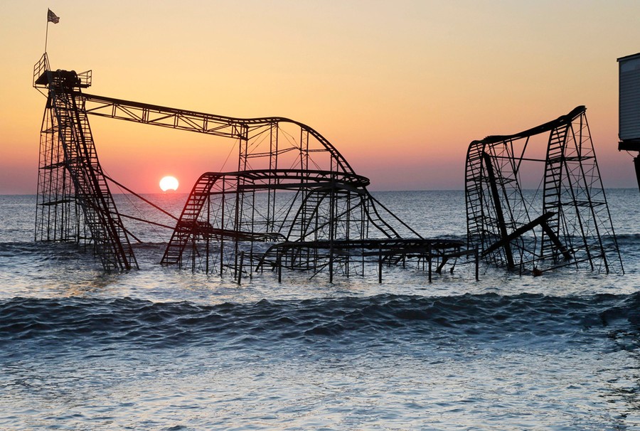 Read moreThis combination of February 25, 2013 and (click to fade) October 13, 2013 photos shows the sun rising in Seaside Heights, New Jersey, behind the Jet Star Roller Coaster which had been sitting in the ocean after part of the Casino Pier was destroyed during Superstorm Sandy, and the same empty site nearly a year after the storm. (AP Photo/Mel Evans) [click image to view transition - javascript required] (AP Photo/Mel Evans) # #