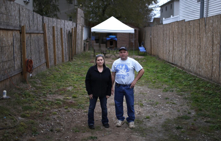Read moreJean and Burt Laurie pose for a photograph on the lot where their house once stood before being destroyed by hurricane Sandy in the Ocean Breeze section of Staten Island, on October 23, 2013. Many on the low lying south shore of Staten island continue to struggle to recover from the hurricane which destroyed hundreds of homes on the island with just days until the one year anniversary of the October 29, 2013 storm. #