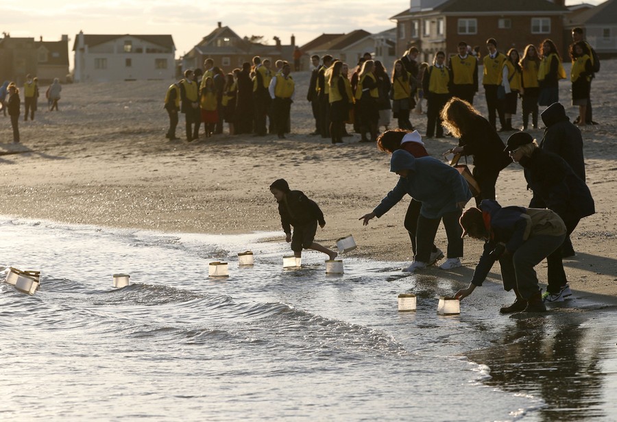 Read moreRockways residents float lanterns containing handwritten personal messages in the water at the conclusion of "Rockaways Rising: Hands Scross the Sand," commemorating the one year anniversary of Superstorm Sandy, on October 27, 2013, in New York. #