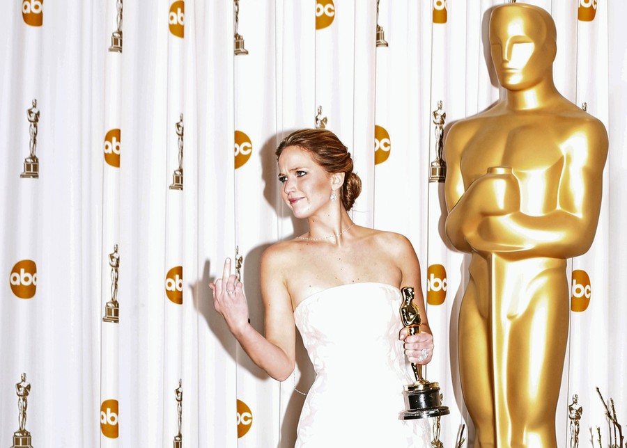 Read moreJennifer Lawrence gestures to photographers off-camera, holding her Oscar after winning the best actress award for her role in "Silver Linings Playbook" at the 85th Academy Awards in Hollywood, California, on February 24, 2013. Lawrence was reacting to some photographers telling her to "watch her step" as she went onto the platform -- she had tripped earlier, while walking up stairs to receive her award on live television. #