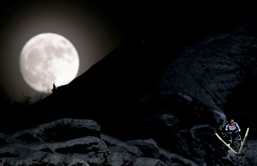Read moreNorway's Anders Bardal jumps during the official training session of the FIS Ski Flying World Cup in Vikersund, Norway, on January 25, 2013, while a full moon rises over the mountain. #