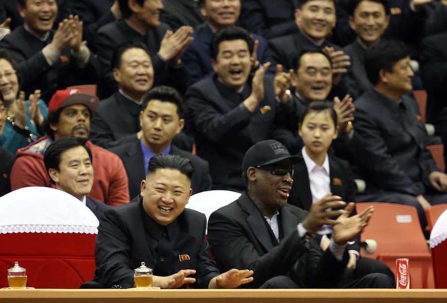 Read moreNorth Korean leader Kim Jong Un and former NBA star Dennis Rodman watch North Korean and U.S. players in an exhibition basketball game at an arena in Pyongyang, North Korea, on February 28, 2013. Rodman arrived in Pyongyang on Monday with three members of the Harlem Globetrotters basketball team to shoot an episode on North Korea for a new weekly HBO series. #