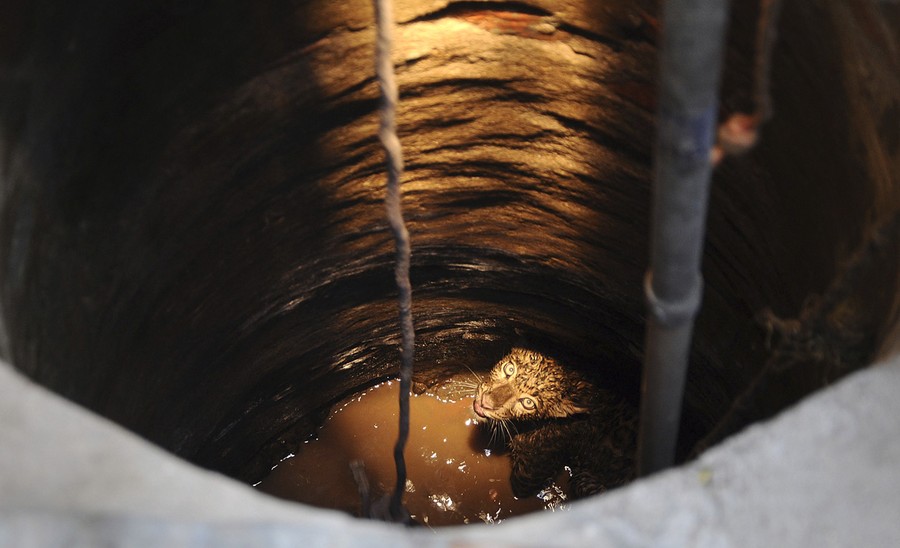 Read moreA leopard trapped in a well looks up to forest officials on the premises of the Kamakhya temple in Gauhati, India, on April 4, 2013. The animal was later tranquilized and rescued. #