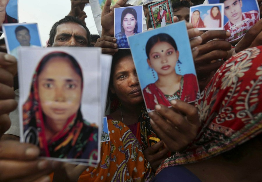 Read moreBangladeshi relatives of workers missing in the building that collapsed on Wednesday hold pictures of loved ones at a makeshift morgue in a schoolyard in Savar, on April 27, 2013. #