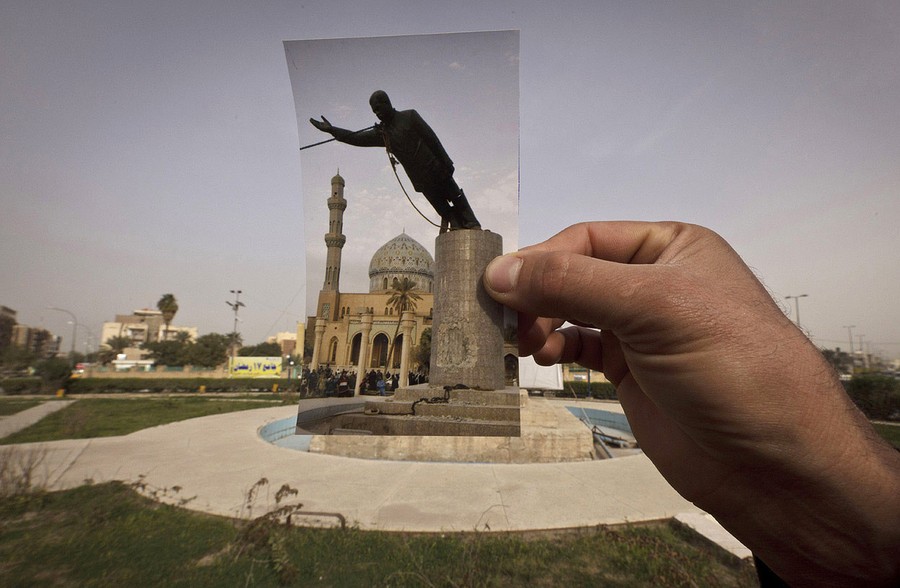 Read moreA March 13, 2013 view of Firdos Square, in Baghdad, Iraq, at the site of an Associated Press photograph taken by Jerome Delay ten years earlier, as the statue of Saddam Hussein was pulled down by U.S. forces and Iraqis on April 9, 2003. Today, the pedestal in central Baghdad stands empty. Bent iron beams sprout from the top, and posters of anti-American Shiite cleric Muqtada al-Sadr in military fatigues are pasted on the sides. #