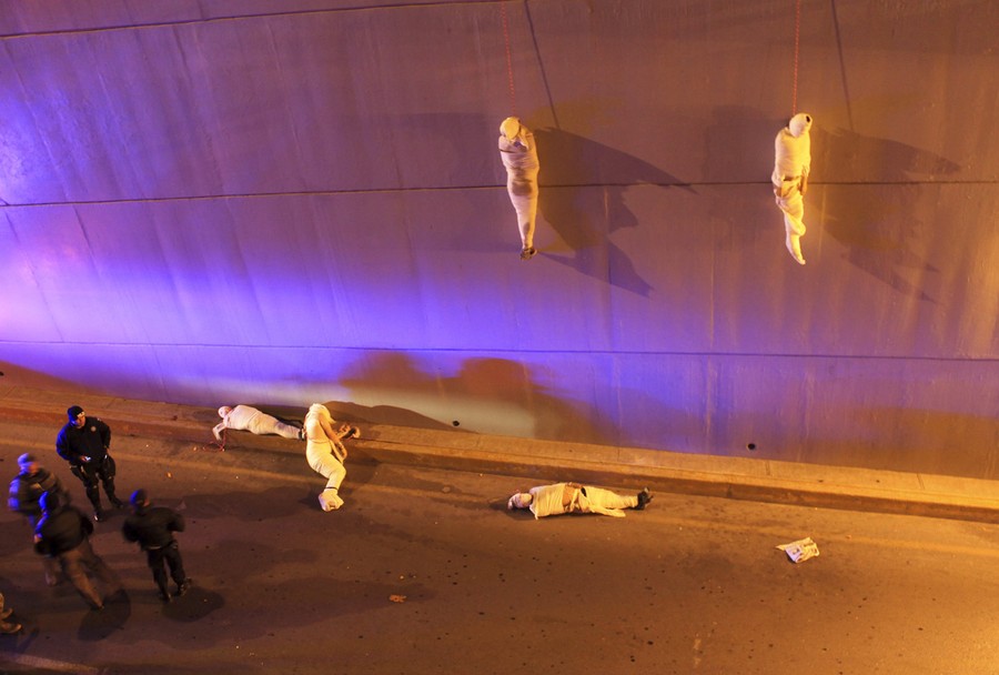 Read moreThe wrapped bodies of two dead people hang from an overpass as three more dead bodies lie on the ground in Saltillo, Mexico, on March 8, 2013. Three of the five male bodies were hanging from the overpass while two others were lying on the ground when they were found early Friday, according to local media. While drug-related violence in Mexico is slightly down from recent years, it remained high throughout 2013. #