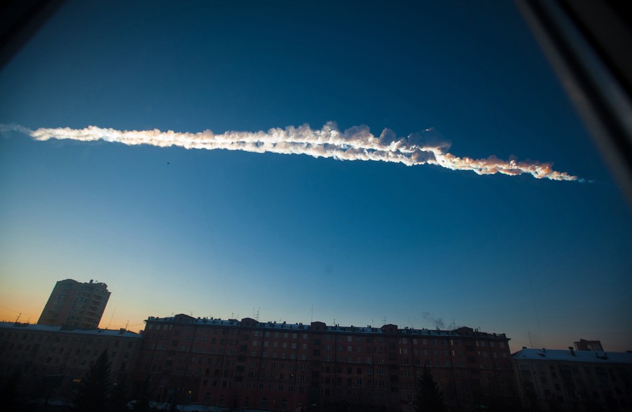 Read moreA meteor's trail over the Ural Mountains' city of Chelyabinsk, about 930 miles east of Moscow, Russia, on February 15, 2013. The 13,000 ton meteor hit Earth's atmosphere at 42,000 mph and exploded, smashing windows and causing hundreds of minor injuries. #