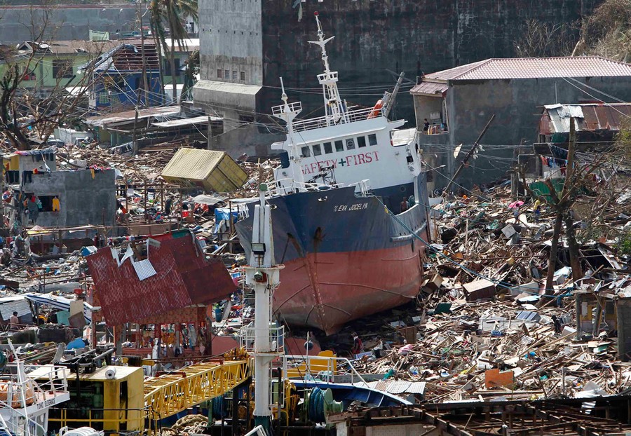 Read moreA cargo ship washed ashore, four days after Super Typhoon Haiyan hit Anibong town, Tacloban city, Philippines, on November 11, 2013. Typhoon Haiyan was the strongest storm ever recorded at landfall, and was responsible for nearly 6,000 deaths, laying waste to cities and towns on Leyte and Samar islands. #