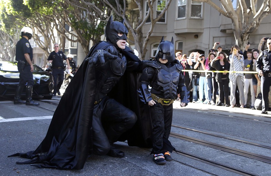 Read moreMiles Scott, dressed as Batkid, walks with Batman before saving a damsel in distress in San Francisco, on November 15, 2013. San Francisco turned into Gotham City on that day, as city officials helped fulfill Scott's wish to be "Batkid." Scott, a leukemia patient from Tulelake in Northern California, was called into service on Friday morning by San Francisco Police Chief Greg Suhr to help fight crime, The Greater Bay Area Make-A-Wish Foundation said. #