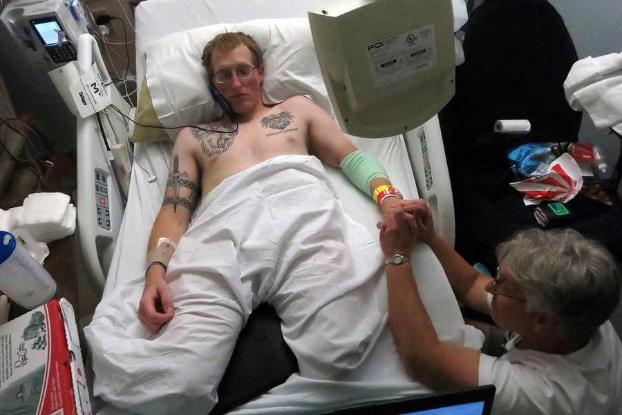 Read moreSgt. Matt Krumwiede of the U.S. Army takes a phone call as his hand is massaged by his mother Pam Krumwiede, after being admitted for an infection at Brooke Army Medical Center in San Antonio, Texas, on November 4, 2013. On June 12, 2012, Krumwiede was on patrol in Afghanistan when he stepped on an IED, which tore away both his legs, damaged his left arm, and ripped open his abdominal cavity. The 22-year-old has since undergone around 40 surgeries and is learning to walk with prosthetic legs. He is keen to re-join the infantry as soon as his injuries allow. #