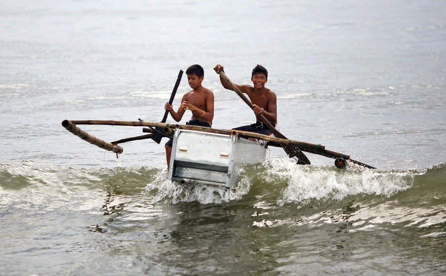 Read moreBoys maneuver their boat, made from a broken refrigerator and bamboo, to the beach in Tanauan, in the province of Leyte, Philippines, on November 20, 2013. After losing their boats and houses in the Typhoon Haiyan, fishermen of a destroyed village in Tanauan started building two-seated boats made of abandoned refrigerators and some wood. The first boat was made by a fisherman, whose children gave him the idea as they wanted to play in it, and soon others followed. The Philippines and international armed forces and aid agencies are struggling to get help to devastated areas due to the extent of the destruction from Typhoon Haiyan. #