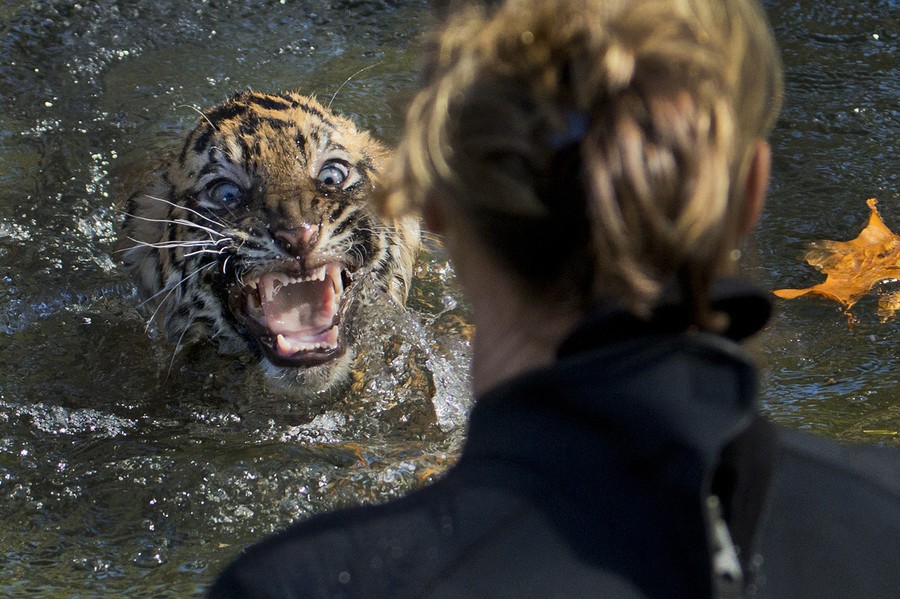 Read moreA three-month-old Sumatran tiger cub named Bandar reacts after being dunked in the tiger exhibit moat for a swimming test at the National Zoo in Washington, District of Columbia, on November 6, 2013. All cubs born at the zoo must take a swim test before being allowed to roam in the exhibit. Bandar passed his test. #