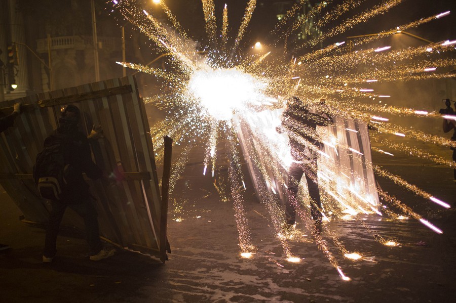 Read moreA burst of fireworks goes off near members of the so-called Black Bloc anarchist group during clashes with police after a march of striking teachers took place to mark National Teachers Day, in Rio de Janeiro, Brazil, on October 15, 2013. A largely peaceful rally of teachers turned violent in Rio when small groups of masked protesters started hurling rocks and gasoline bombs and set fire to a passenger bus. #