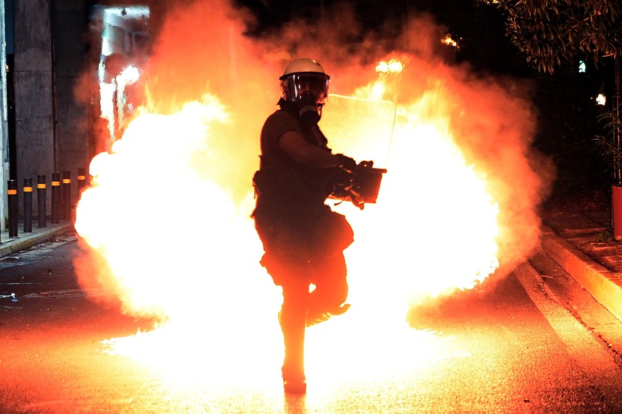 Read moreA molotov cocktail explodes in front of riot police on September 25, 2013 during clashes with demonstrators in Athens, Greece. Police clashed with protesters in Athens at the end of a huge march sparked by the murder of an anti-fascist musician, allegedly at the hands of a self-confessed neo-Nazi. Protesters were seen hurling petrol bombs at riot police, who responded with tear gas a few hundred meters from the headquarters of the neo-Nazi party Golden Dawn. #