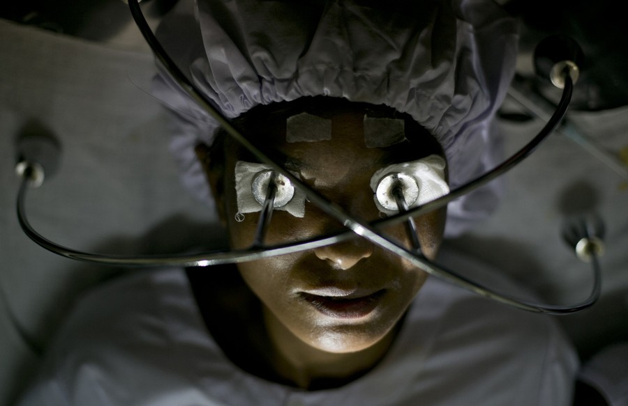 Read moreSaw Min lies on a bed with weights on her eyes after receiving local anesthesia ahead of a cataract operation at a government hospital in Bago, Myanmar, on October 22, 2013. She waited with hundreds of Myanmar's poorest villagers to be prepped for the simple, free surgery she hopes will restore her sight. "My heart is racing," said the 38-year-old mother of five, who lost all vision in her left eye one year ago and, in the months that followed, all but 20 percent in her right. #