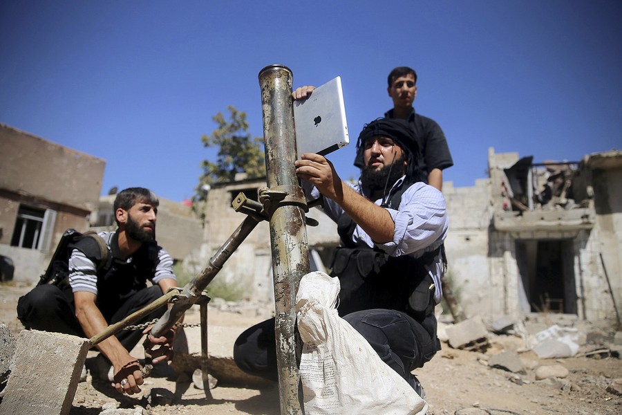 Read moreA member of the "Ansar Dimachk" Brigade, part of the Asood Allah Brigade which operates under the Free Syrian Army, uses an iPad during preparations to fire a homemade mortar at one of the battlefronts in Joubar, a suburb of Damascus, Syria, on September 15, 2013. #